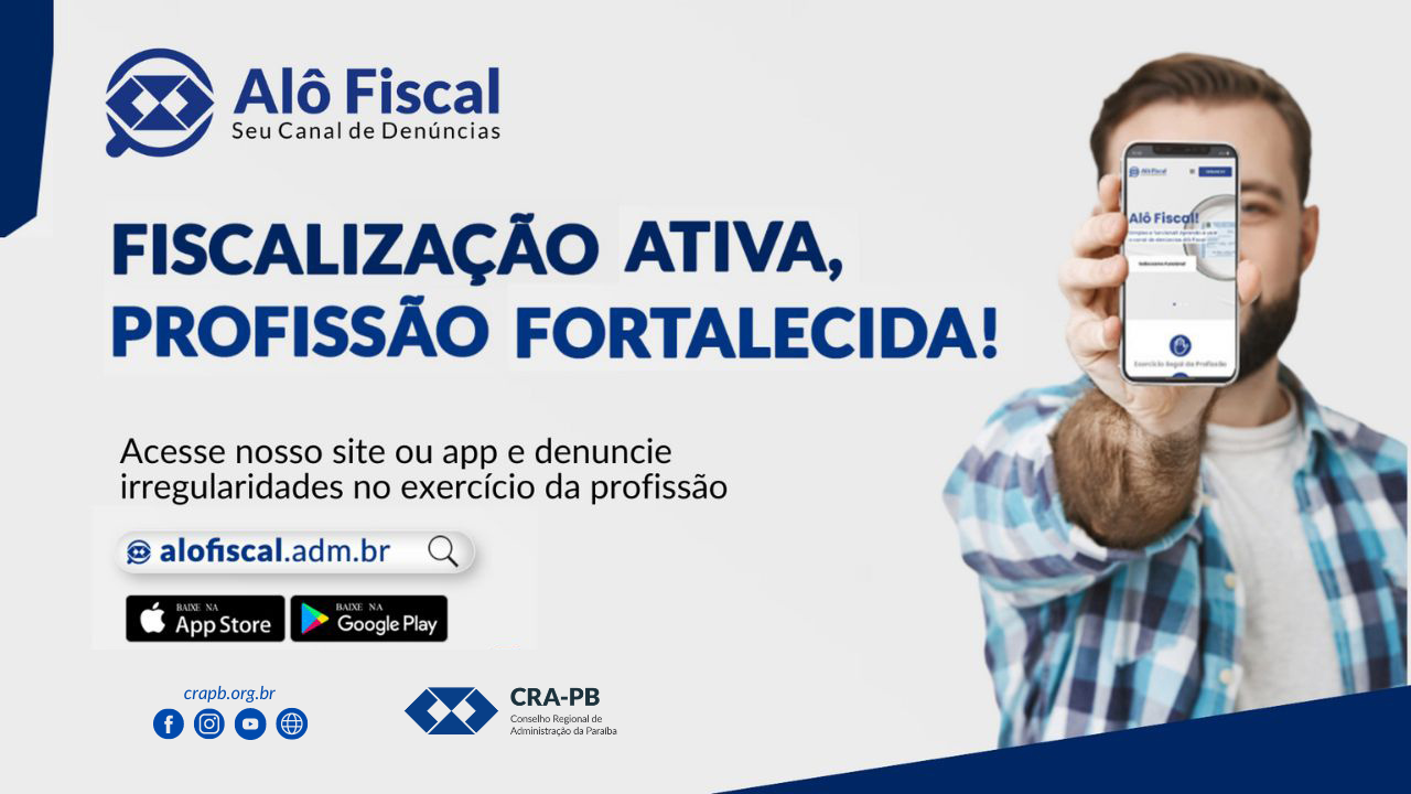 O “Alô Fiscal” é um canal que permite aos cidadãos contribuírem para a valorização da categoria de administradores, realizando denúncias relacionadas a práticas ilegais ou inadequadas envolvendo a profissão de administrador. Este canal é especialmente útil para denunciar situações como Exercício Ilegal da Profissão, Edital de Concurso que não exige registro profissional para vagas de áreas conexas à Administração, ou Edital de Licitação que visa contratar empresas para atividades relacionadas à Administração sem o devido registro no CRA-PB.